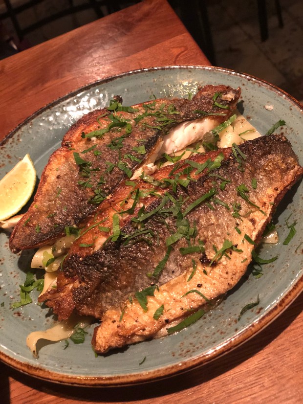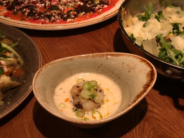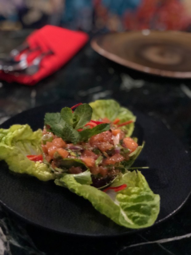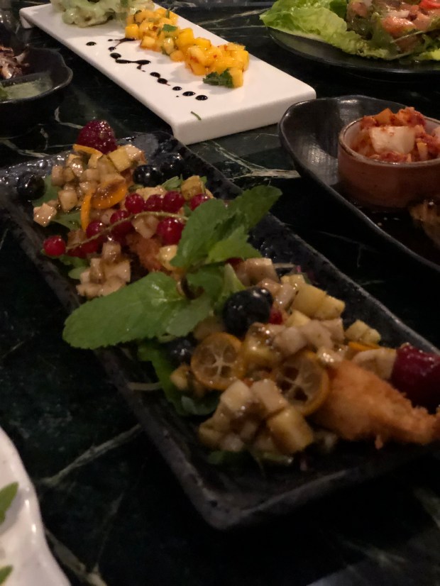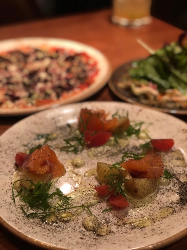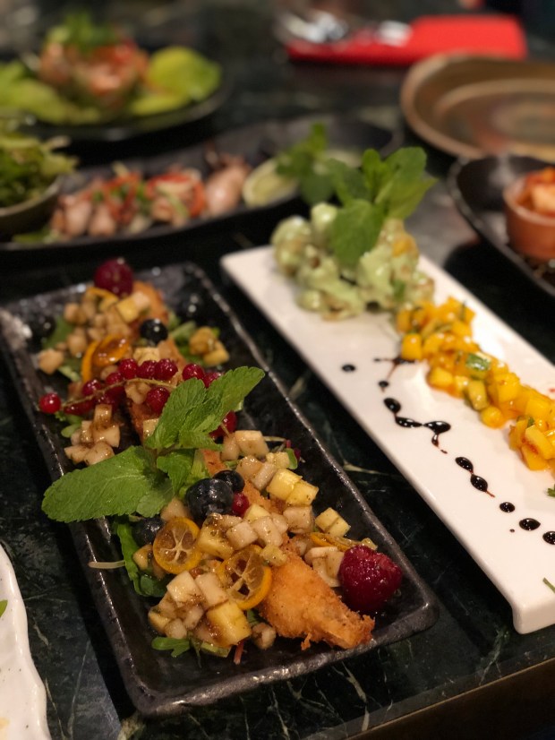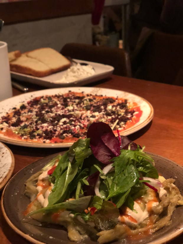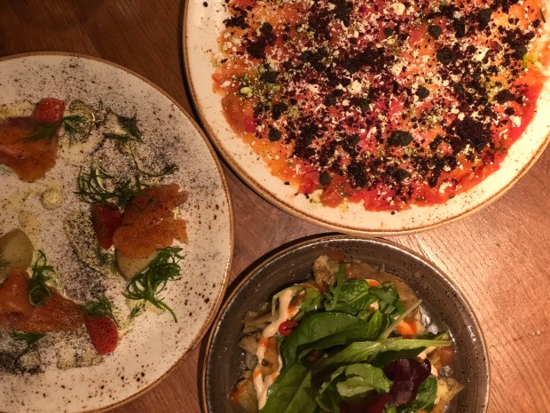 Tra i piatti che abbiamo provato sono rimasta colpita soprattutto dall’antipasto di carpaccio di verdure con pomodori e melanzane affumicate, reso straordinariamente croccante con l’aggiunta di quinoa tostata.